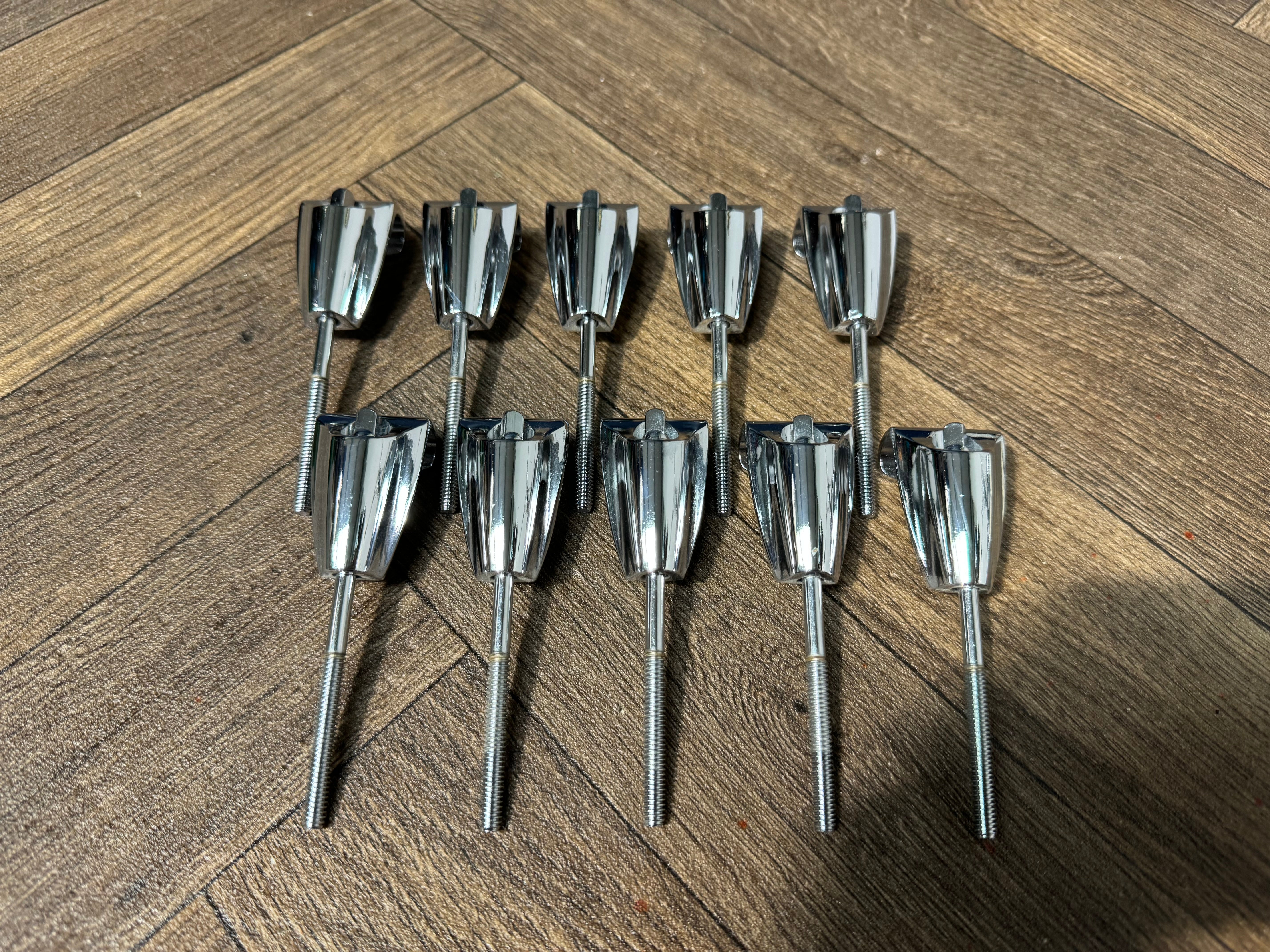 Set of tension rods and claws for a bass drum. Please check the sizes in the photos but generally they are generic to any drum. Perfect for spares or a project.