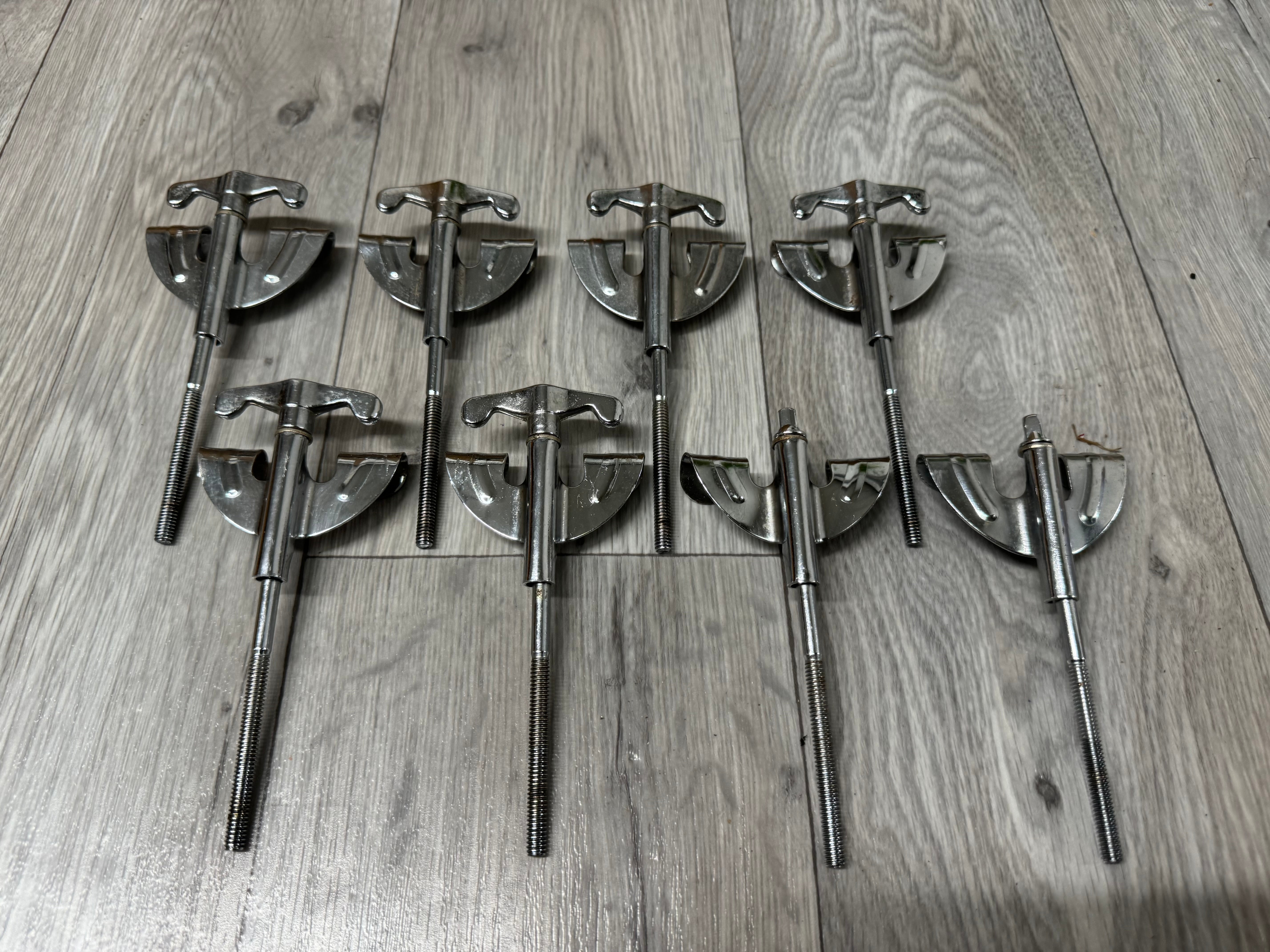 Set of tension rods and claws for a bass drum. Please check the sizes in the photos but generally they are generic to any drum. Perfect for spares or a project.