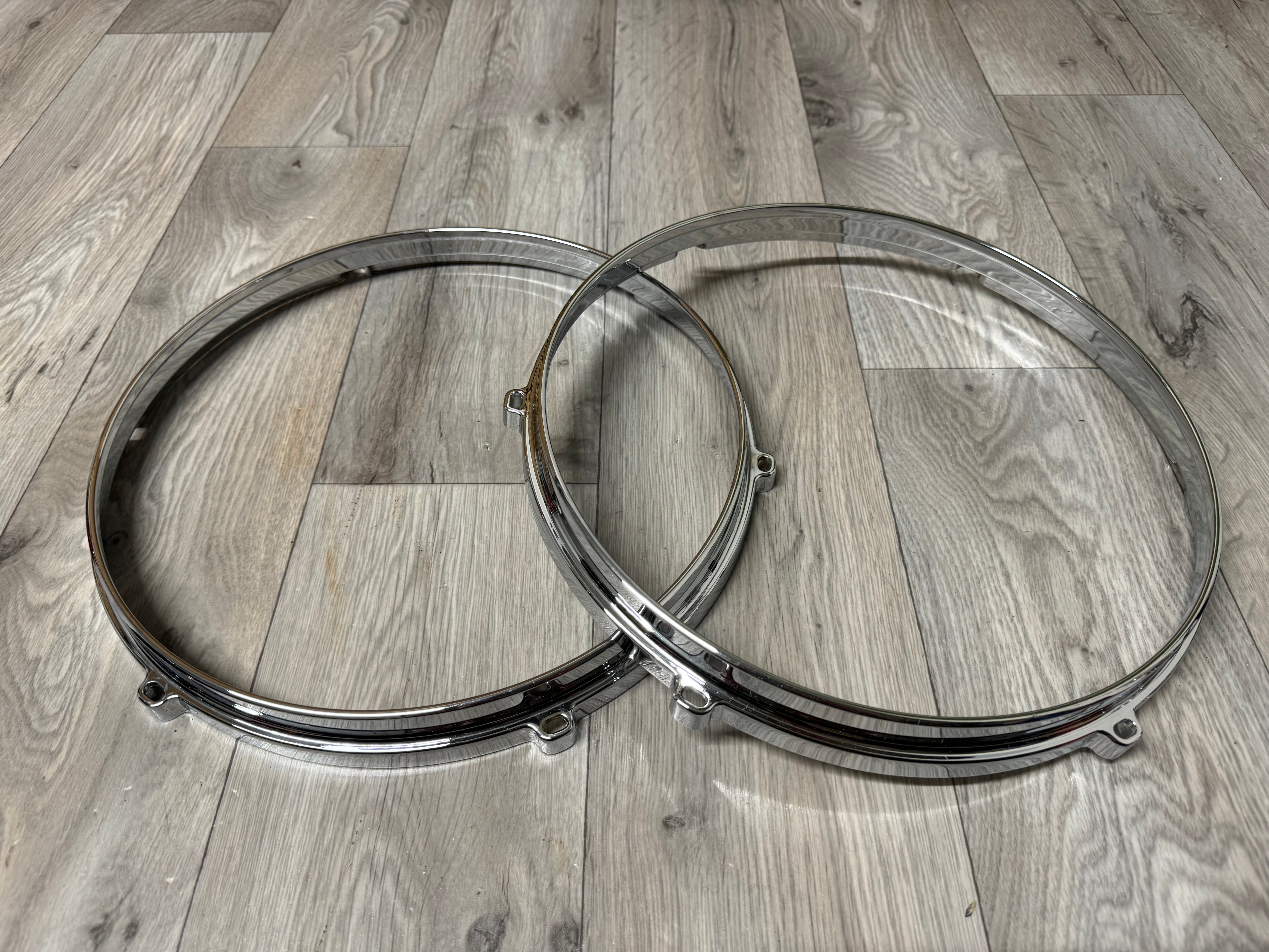 A pair of Natal 10” Tom drum hoops, ideal for spares, replacement of current or a project. These have 6 holes for mounting tension rods.